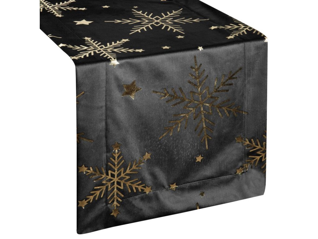 Slávnostný, zamatový, ozdobný behúň s lesklou potlačou snehových vločiek bude perfektným doplnkom vášho štedrovečerného stola.