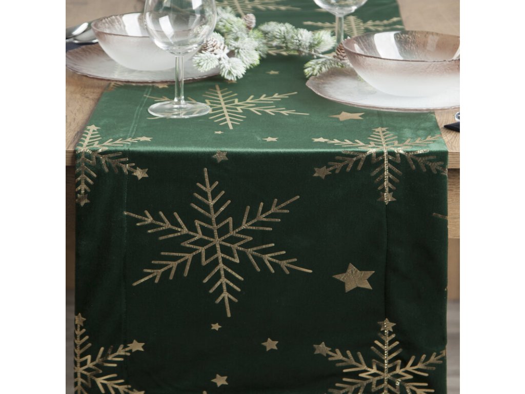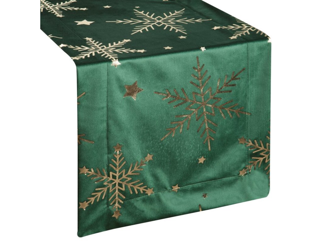 Vianočný zamatový behúň na stôl v zelenej farbe so zlatými vločkami 40 x 140 cm