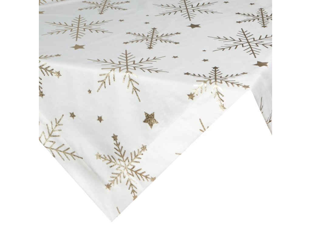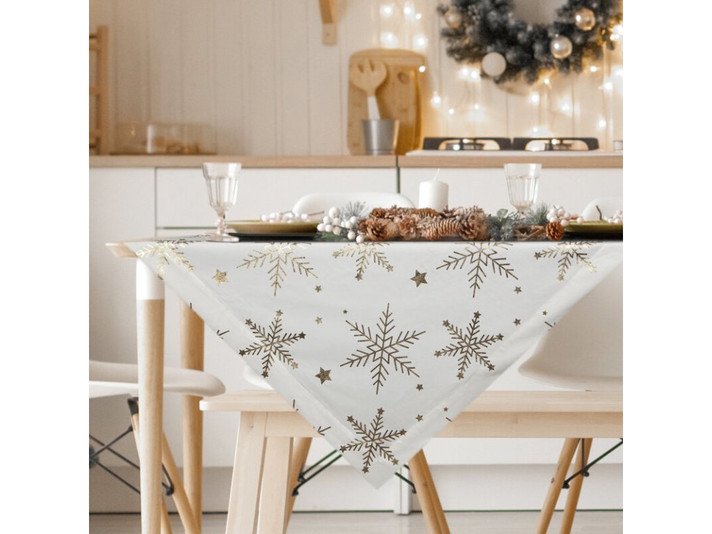 Vianočný zamatový obrus na stôl v bielej farbe so zlatými vločkami 85 x 85 cm