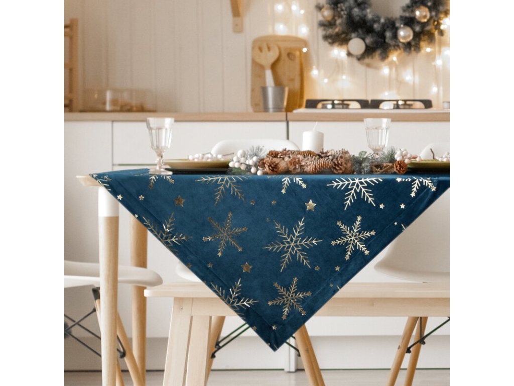 Vianočný zamatový obrus na stôl v granátovomodrej farbe so zlatými vločkami 85 x 85 cm