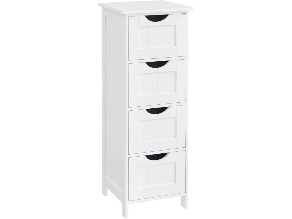 Moderná stojaca kúpeľňová skrinka s 4 zásuvkami v bielej farbe je praktickým a elegantným riešením pre organizáciu priestoru v kúpeľni aj ďalších miestnostiach domácnosti. Vďaka úzkej a vyššej konštrukcii sa skvele hodí aj do menších priestorov, kde je dôležité využiť každý centimeter.