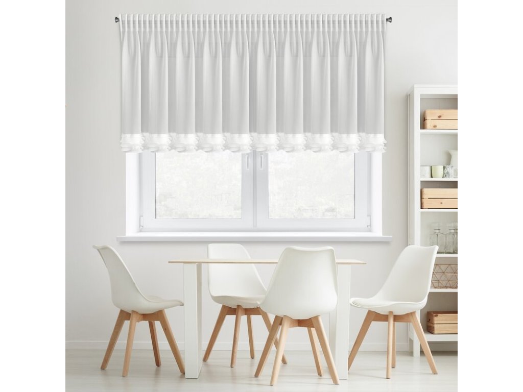 Záclona LUISA v čisto bielej farbe je dokonalým riešením pre menšie okná alebo ako súčasť väčšej okennej kompozície. Vyrobená zo 100% polyesteru s gramážou 60 GSM ponúka optimálnu kombináciu ľahkosti a kvality. Jej povrch je zdobený jemnou dekoratívnou aplikáciou, ktorá dodáva interiéru elegantný a nadčasový vzhľad.