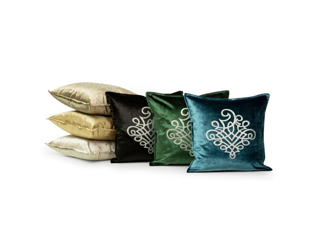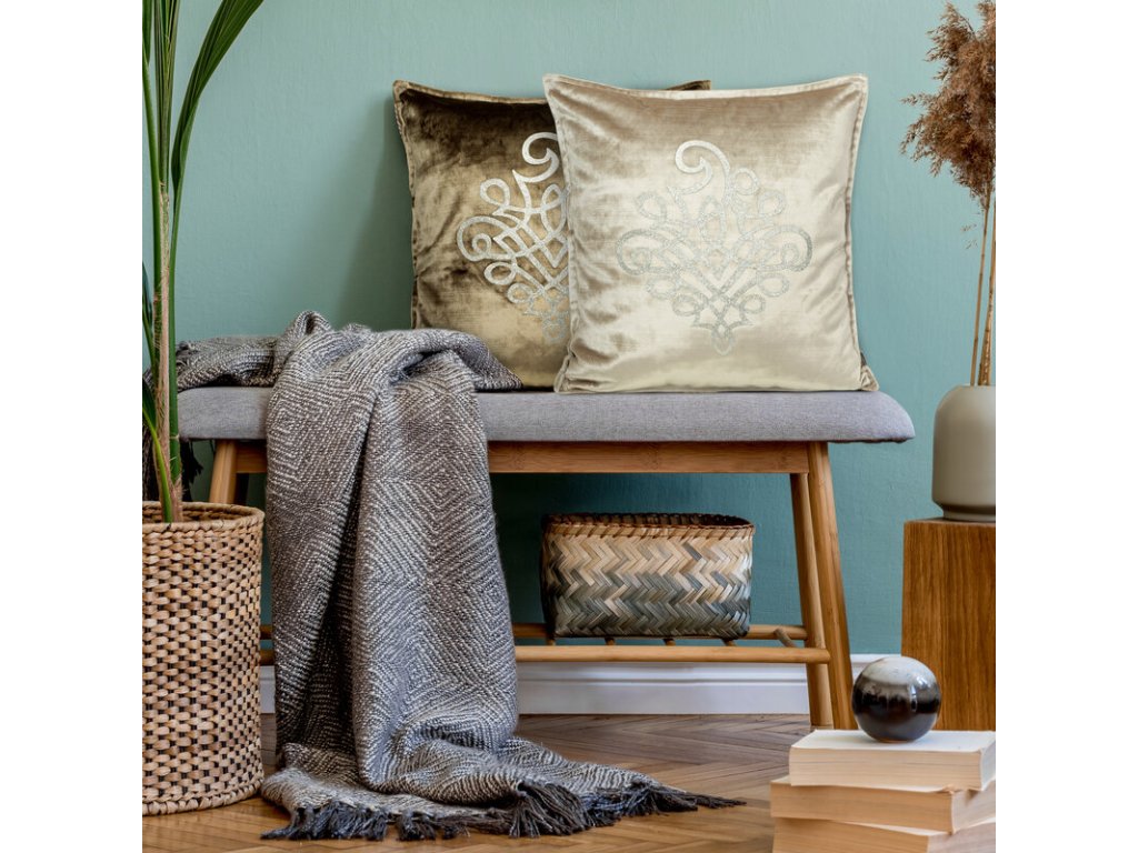 Dekoratívna obliečka na vankúš z mäkkej zamatovej látky ozdobená striebornou ornamentovou aplikáciou.