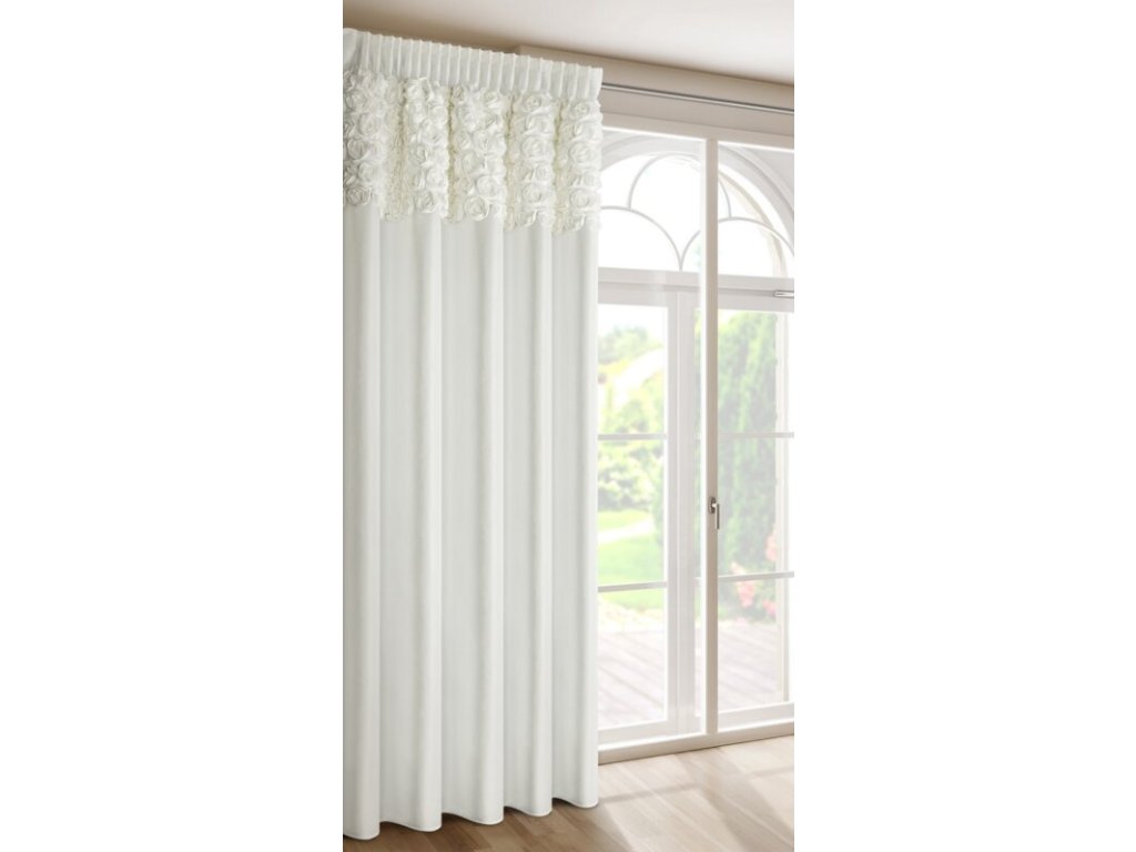 V hornej časti je záves zdobený krásnou 3D aplikáciou ruží z látky, ktorý dodáva romantický, dekoratívny nádych.