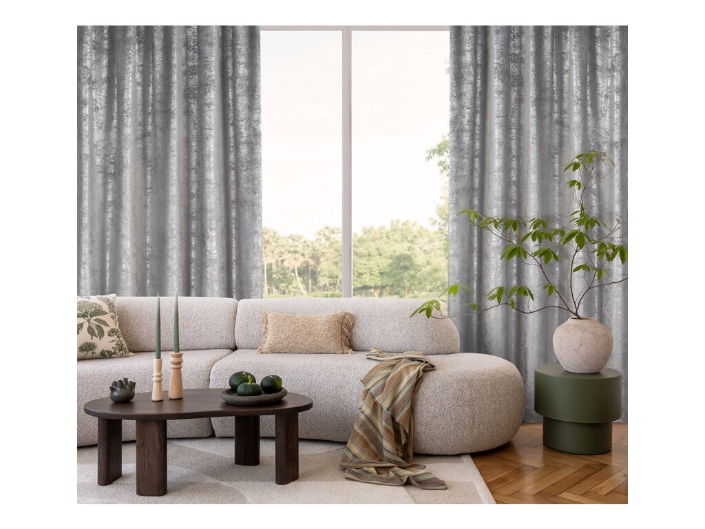 Vyrobený je z vysoko kvalitného zamatového materiálu s hladkou a hebkou štruktúrou, ktorá je príjemná na dotyk a odolná voči poškodeniu. Strieborná potlač decentne odráža svetlo, čím dodáva látke jemný trblietavý efekt a interiéru šmrnc.